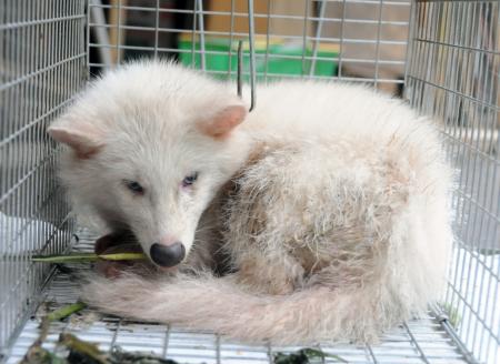 白いタヌキが15日、岡山市北区の池田動物園に譲り渡された。