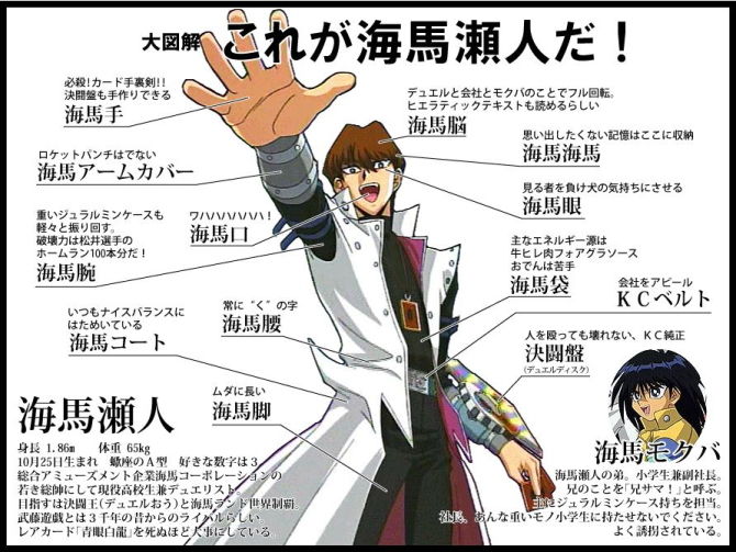 ※海馬 瀬人(かいばせと)は、漫画『遊☆戯☆王』に登場する人物。「武藤遊戯」のライバルであり、準主役キャラ。現役高校生でありながら、大企業「海馬コーポレーション」の若手社長を務める程のエリートで文武両道。ソリッドビジョンシステム関連を手掛け、ヘリコプターやジェット機も操縦できる。天才的なゲームプレイヤーでもあり、特に「マジック&ウィザーズ」と「チェス」を好み、「カードの貴公子」の異名で呼ばれている。ライバルである遊戯には一見すると実力で勝利した事は一度も無いが遊戯本人も「友情の力が無ければ負けていた」と実力を認めており、互角に近い実力を有し戦う事が出来る天才的な人物。(wikipedia参照)