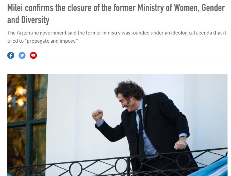 アルゼンチンのハビエル・ミレイ大統領が、女性・ジェンダー・多様性省の完全閉鎖を発表。