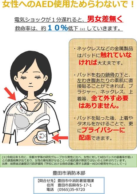【画像】「女性へのAEDを躊躇わないで!但し注意点があります!」 2026年03月05日 カテゴリ:画像ネタ mixiチェック 1 : 5ちゃんねるからVIPがお送りします : 2023/09/02(土) 10:43:32.974 ID:SL2kiEDc0 下着を外さないで!必要最低限だけズラして! AEDを貼り付けたらすぐに服をかけて! 周囲を取り囲んで隠して! 【画像】「女性へのAEDを躊躇わないで!但し注意点があります!」 →続きを読む タグ :#女性#AED