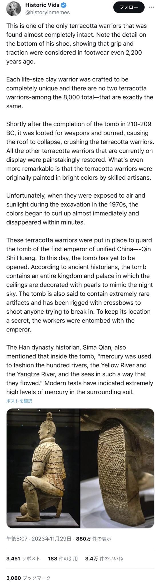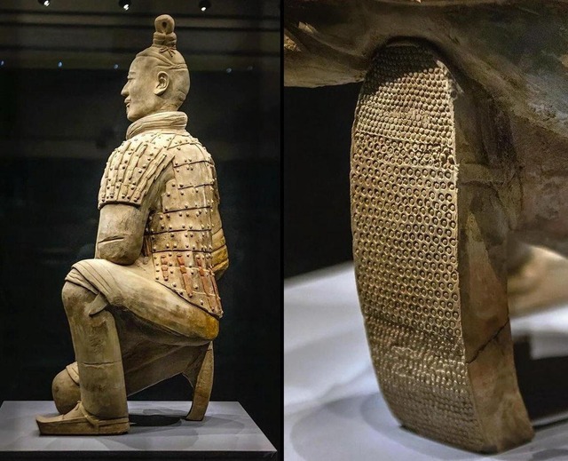 これは、ほぼ完全な形で見つかったわずかな兵馬俑の一つです。彼の靴底のディテールに注目してください。2,200年前でも履物のグリップと牽引が考慮されていたことが分かります。